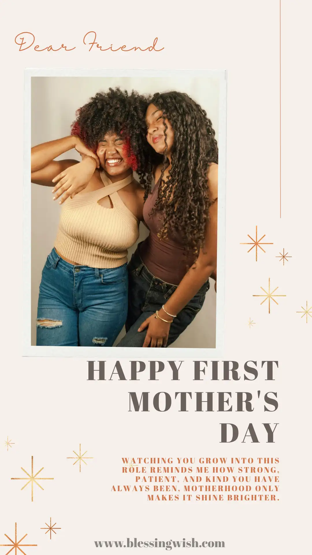 - Happy first Mother’s Day my dear friend, seeing you step into motherhood with so much love and strength makes me truly proud of the amazing woman you are becoming.