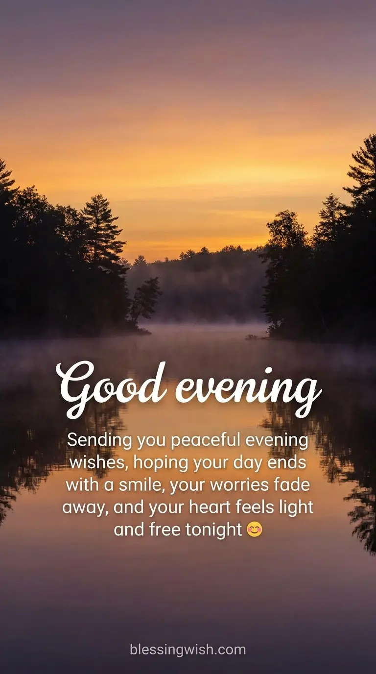 - Sending you peaceful evening wishes, hoping your day ends with a smile, your worries fade away, and your heart feels light and free tonight 😊