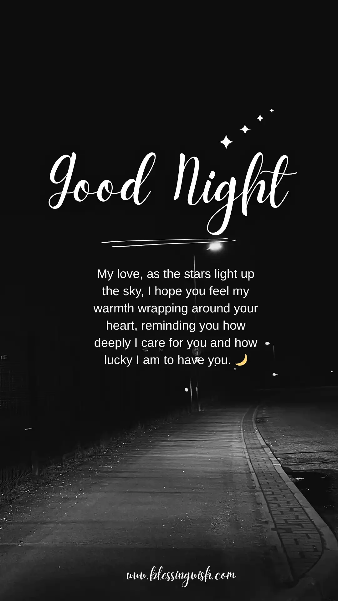 - Good night my love, as the stars light up the sky, I hope you feel my warmth wrapping around your heart, reminding you how deeply I care for you and how lucky I am to have you. 🌙✨
