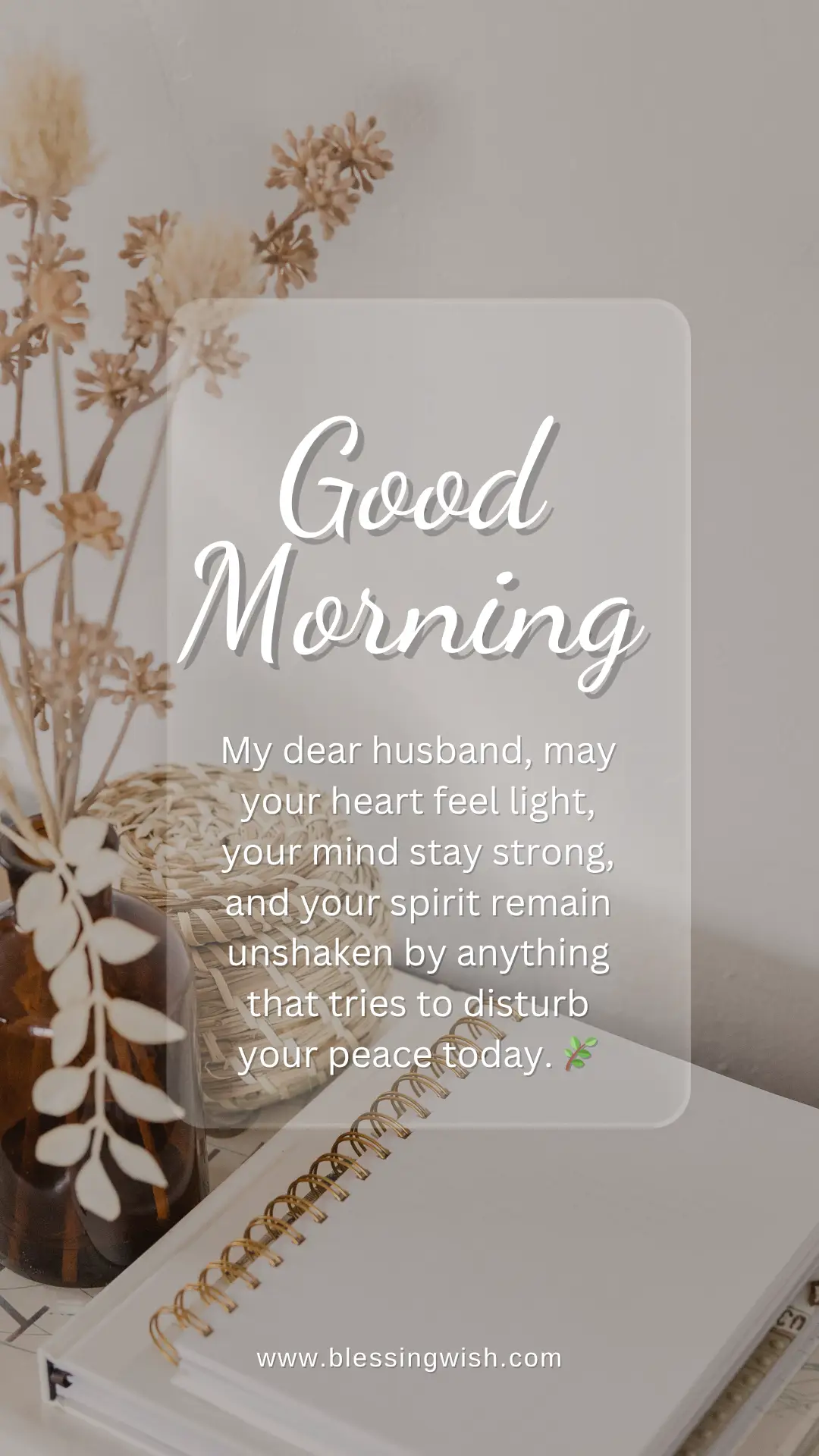 - My dear husband, may your heart feel light, your mind stay strong, and your spirit remain unshaken by anything that tries to disturb your peace today. 🌿